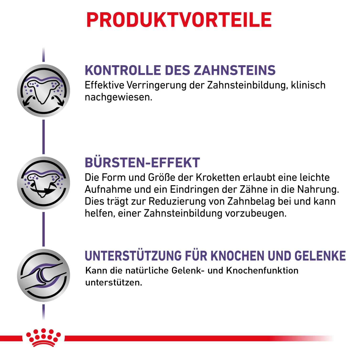 - Bürsten-Effekt: Die Kroketten von ROYAL CANIN Dental Medium & Large Dogs wurden speziell so gestaltet, dass beim Kauen ein Zahnputz-Effekt entsteht. Die Form und Größe der Kroketten erlauben eine leichte Aufnahme und ein tiefes Eindringen der Zähne in die Nahrung. Dies trägt zur Reduzierung von Zahnbelag bei und kann helfen, einer Zahnsteinbildung vorzubeugen.